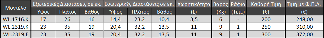 - Τα μοντέλα WL.1716.K και WL.2319.K φέρουν μηχανική κλειδαριά και το μοντέλο WL.1716.E φέρει ηλεκτρονική κλειδαριά.