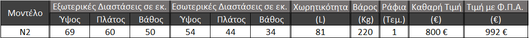 ΕΣΩΤΕΡΙΚΟ: Εσωτερικά υπάρχει ένα ράφι (ρυθμιζόμενο καθ’ ύψος) και μία θυρίδα στο πάνω μέρος ύψους 12 cm η οποία ασφαλίζει με κλειδαριά. Το χερούλι χειρισμού των εμβόλων, η χειρολαβή έλξης και το επιστόμιο της κλειδαριάς είναι από ορείχαλκο επιχρωμιωμένο.